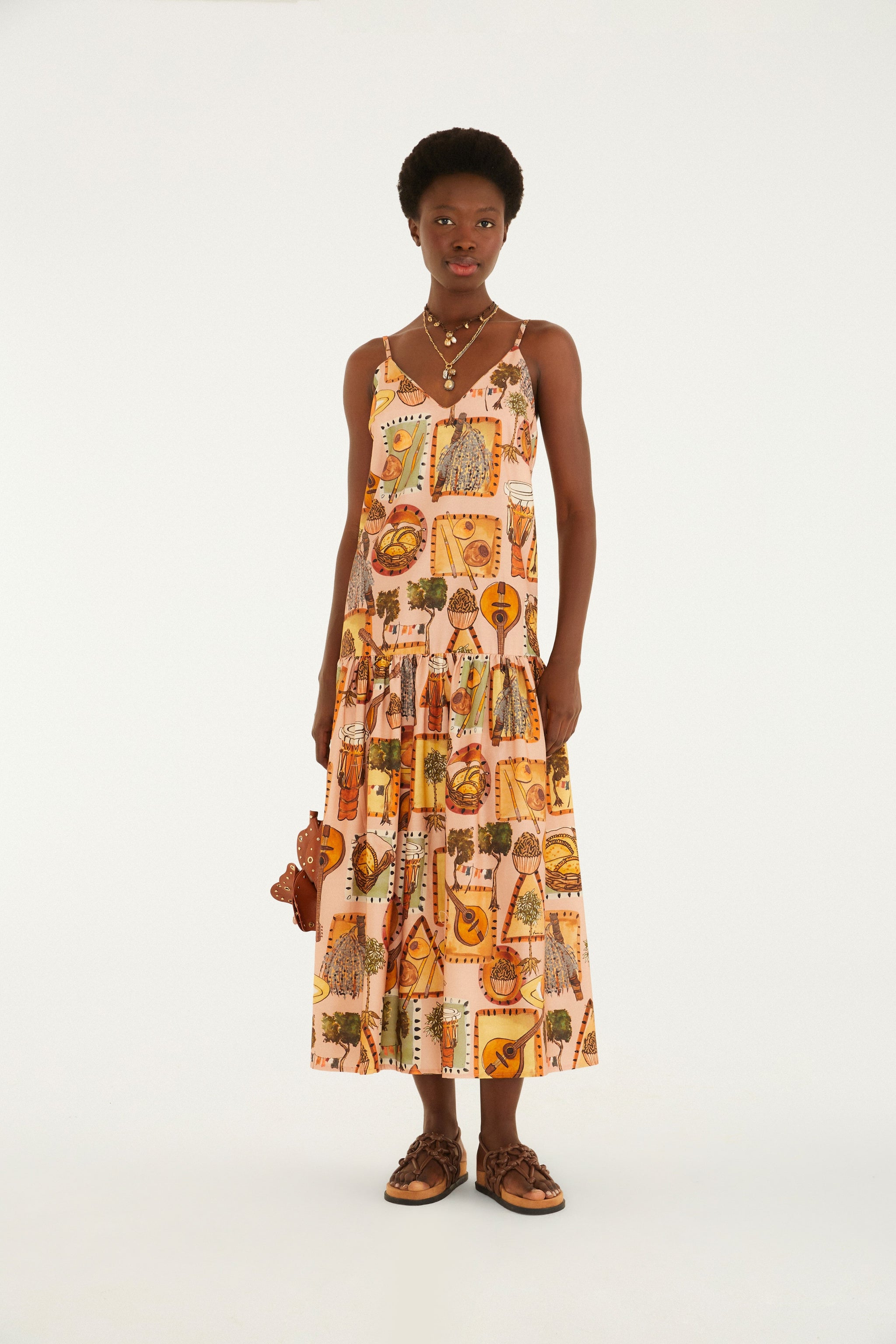 Vestido bohemio: con tirantes finos y escote pronunciado, presenta un diseño fluido que garantiza ligereza en los días cálidos. El largo midi, combinado con un corte holgado, proporciona comodidad y movimiento. Ideal para ocasiones informales, como paseos al aire libre o reuniones informales. FARM Rio, colección Carioca - invierno 2026.