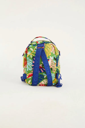 Borogodó Bosque dos Pássaros green backpack. In a mini size, measuring 20x11x15cm, the piece has a top zipper closure and features adjustable straps, a front pocket with a zipper closure and pull tab, a hand strap, and shoulder straps made of grosgrain ribbon. It can be used on the back or as a shoulder bag. What you don't wear, you live.
