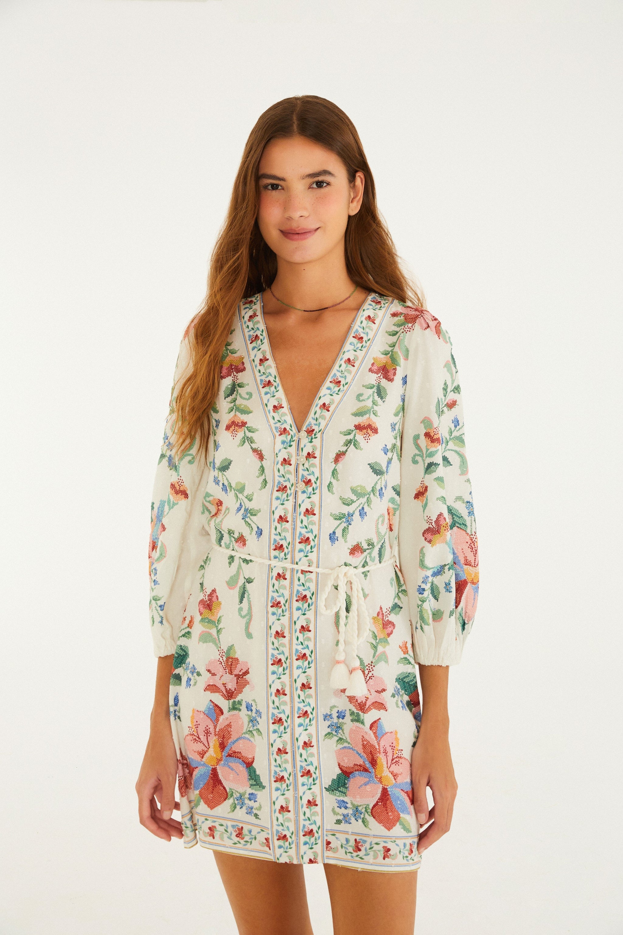 Vestido corto con estampado de brisa serena. Con escote en V y un delicado acabado, presenta mangas abullonadas que le dan un toque especial. La cintura ajustable con cinturón realza el diseño fluido, ideal para un día informal o una cita al atardecer. FARM RIO Original - Verano 26.