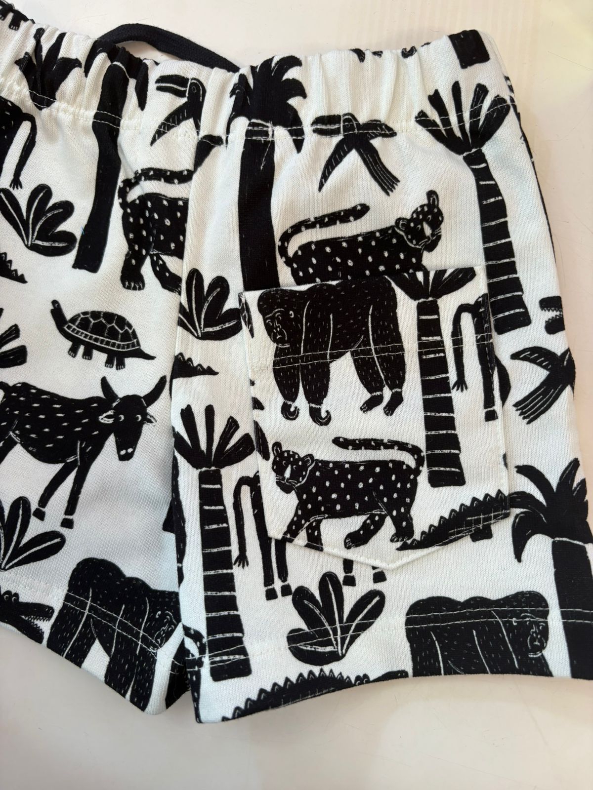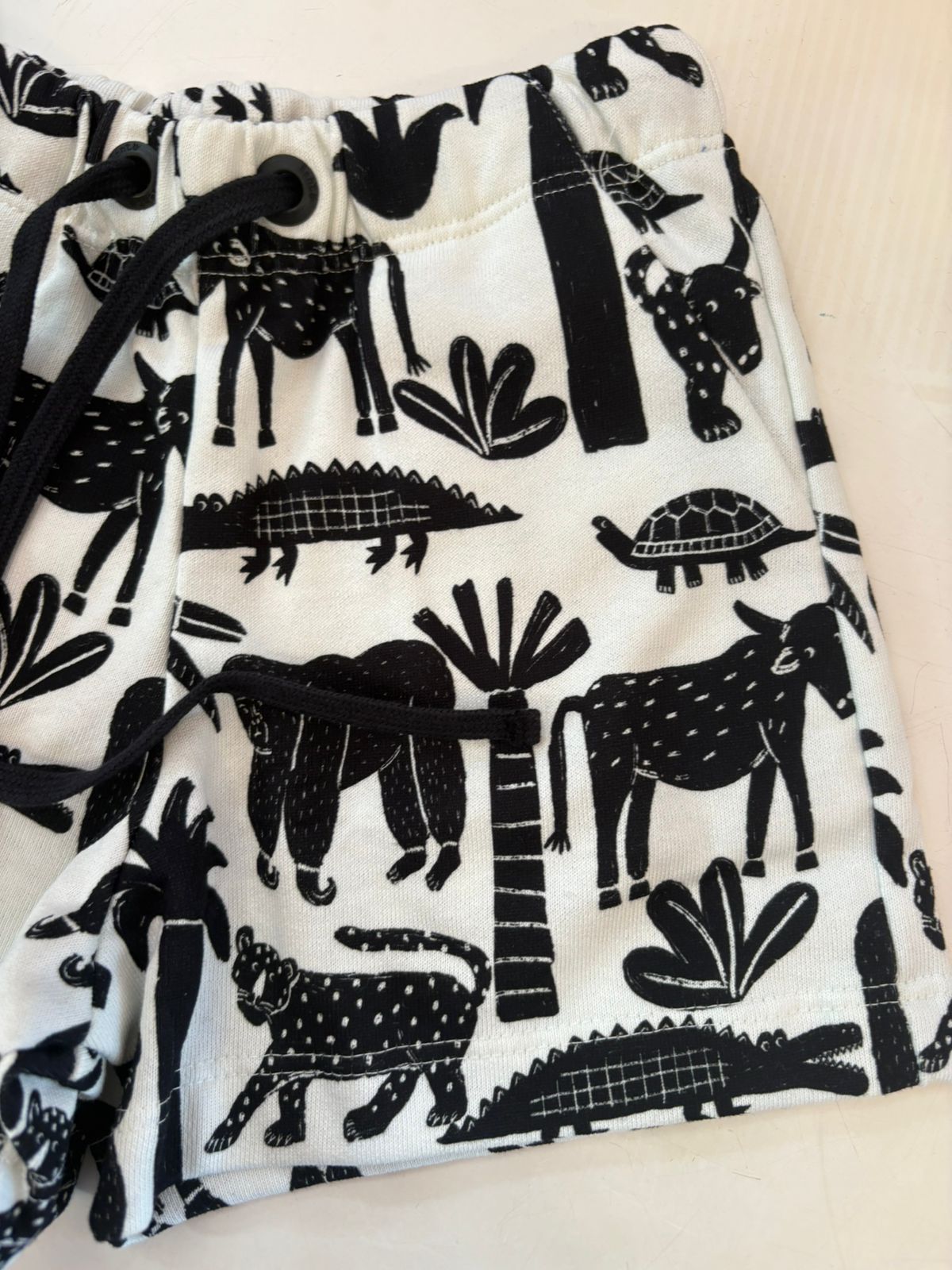 Sweatshirt shorts for children, with pockets, waist adjustment, and B&W print designs.