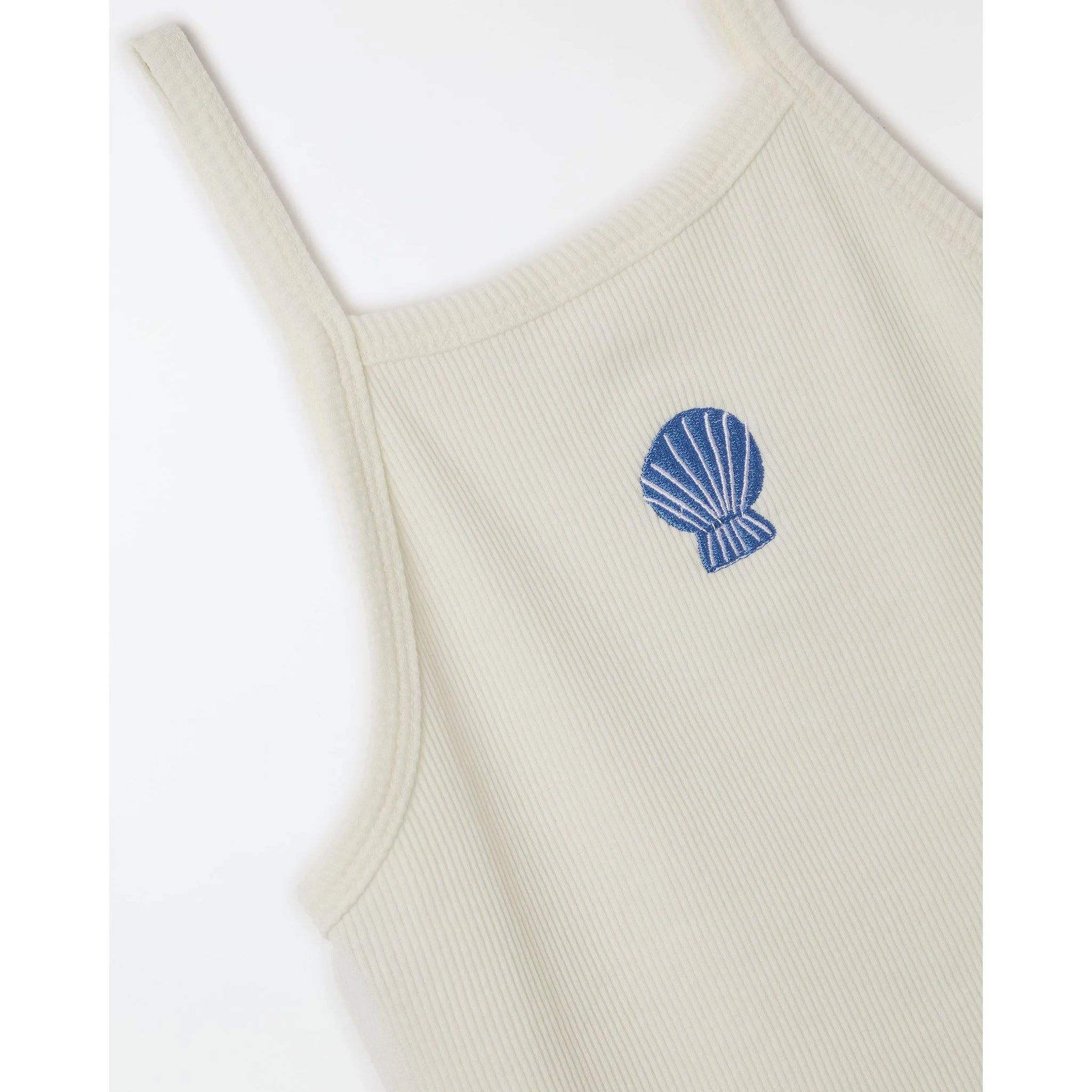 Rib tank top with shell embroidery on the front, developed in ribbed knit. The clothing, part of the FARM Futura line, has straps and a straight neckline, bringing comfort and modernity to the look. The texture of the fabric adds a special touch to the versatile model, ideal for different occasions.