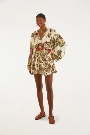 Raiana floral print blouse. Featuring a V-neck and drawstring detail, it exudes lightness and a relaxed feel. The wide sleeves offer movement and comfort, while the ruffles at the hem add a special touch. Perfect for casual outings and relaxing moments.