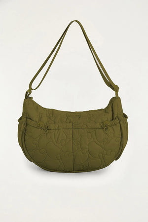 Casual sporty bag with a main opening secured by a zipper. Two small front pocket supports with elastic stopper closures. Side mesh pockets for holding a bottle. Adjustable strap for crossbody use.