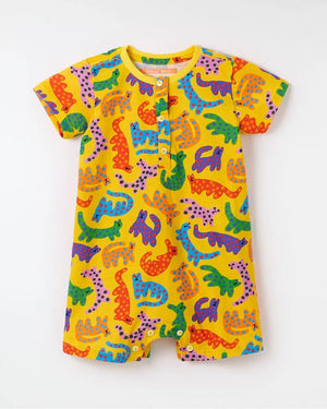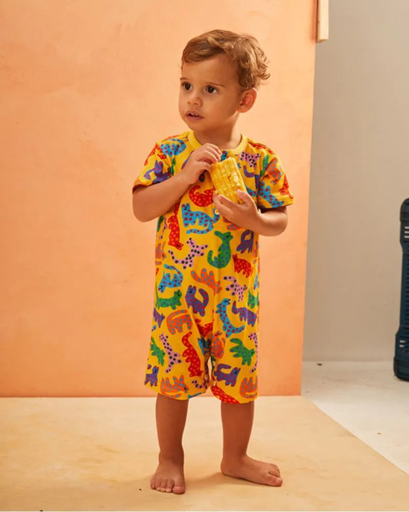 Macaquinho for babies unwrapped in cotton wool, with a cinnamon finish without a round trim, short sleeves, front buttoning and no crotches to facilitate the change of clothes and the designs of the Oncitas print.