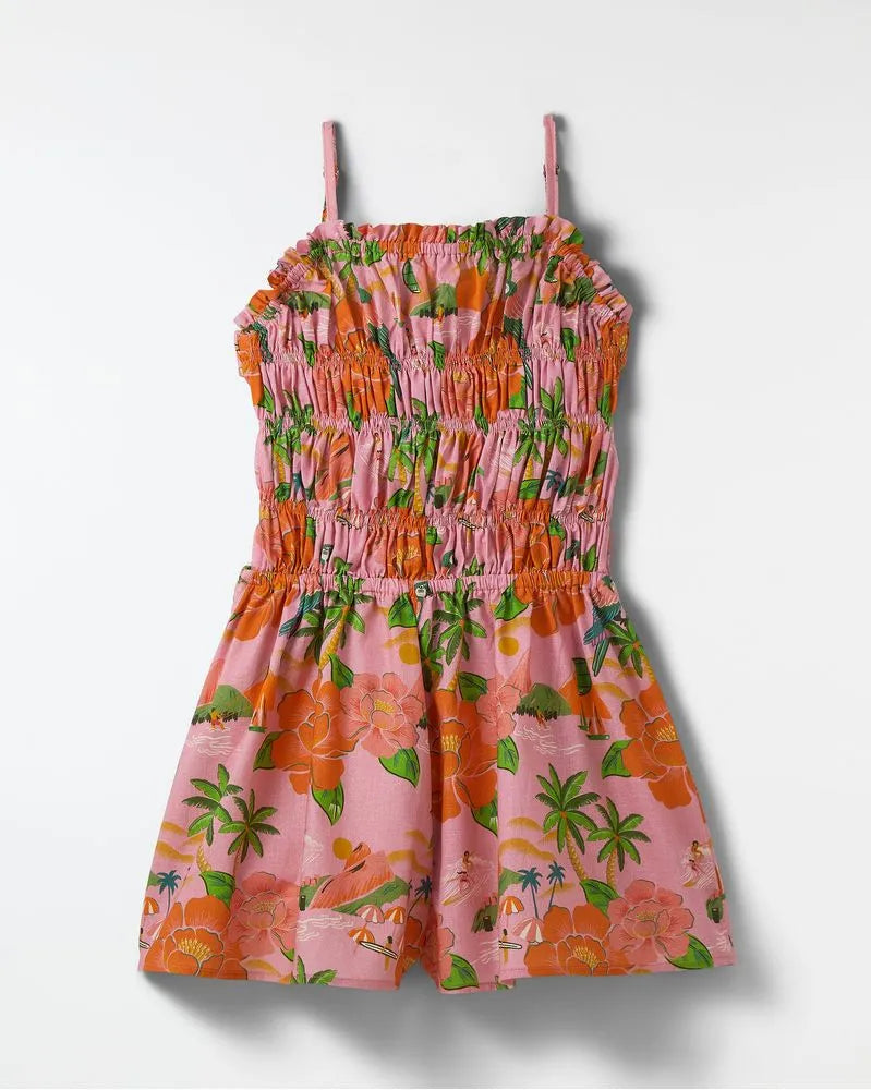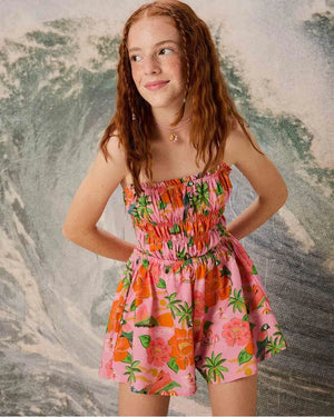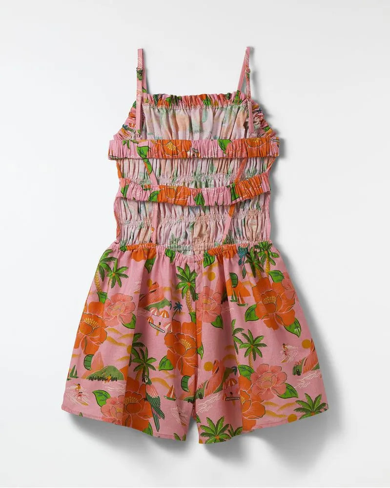 This romper features the Rio de Flor print, part of the FARM Futura line. It has adjustable straps, a smocked bust, a ruffled straight neckline, and a back cutout with elastic straps. The loose fit provides comfort and style for various occasions.