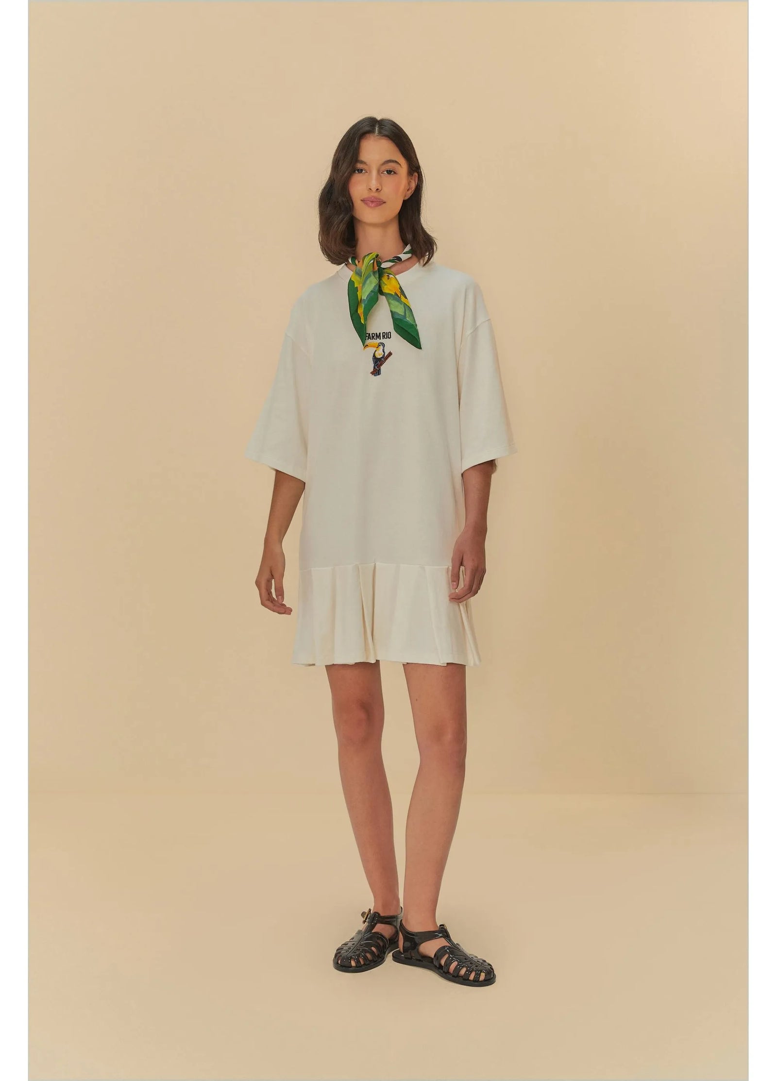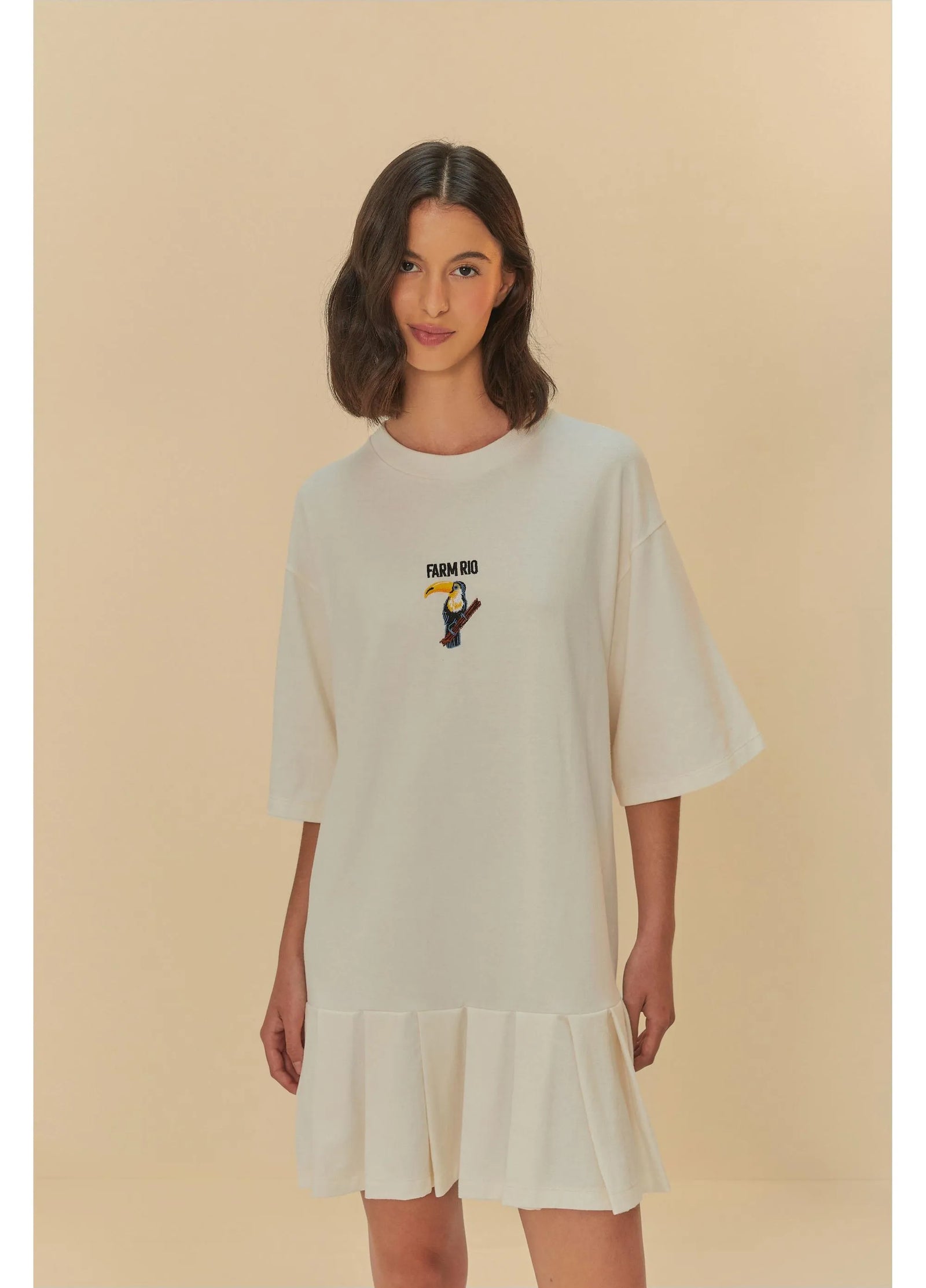 Vestido Curto Pregas Bordado Off White
