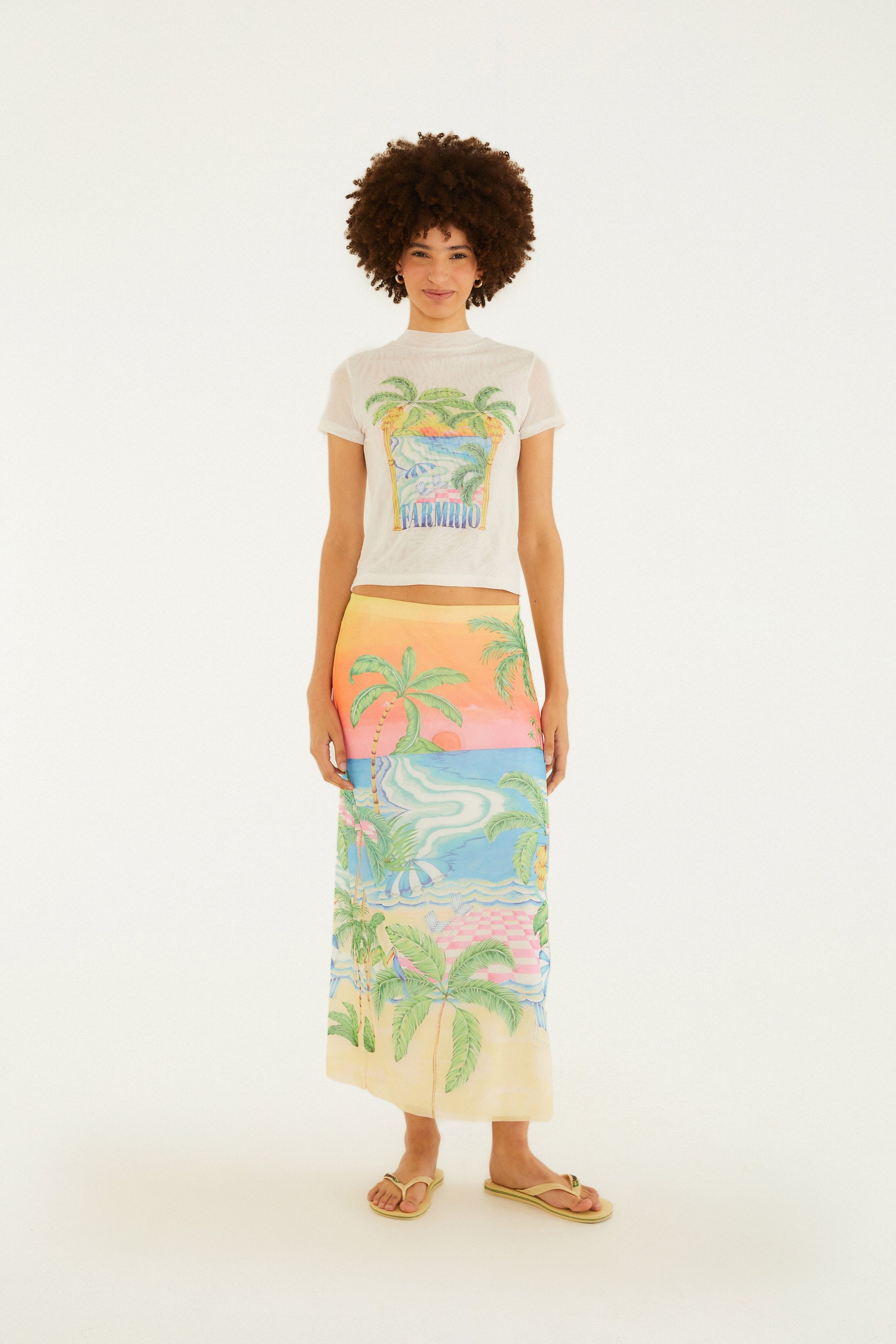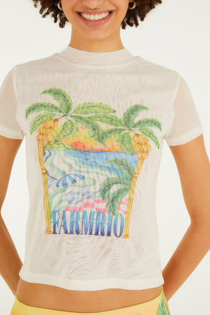 Blusa de tul con estampado de paisajes soleados. Confeccionada en tul ligero, presenta cuello alto y mangas cortas con un delicado acabado. Su corte recto ofrece comodidad y versatilidad, perfecta para un look casual o una salida nocturna con amigos. El estampado único refleja la vibrante esencia de la marca. FARM RIO Original - Verano 26.